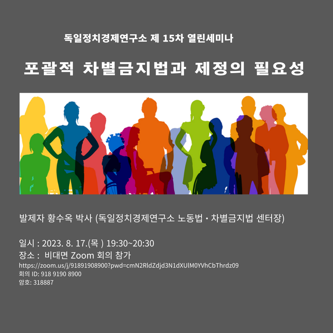 제 15차 열린세미나에서 황수옥 센터장은 "포괄적 차별금지법과 제정의 필요성"에 대해 발제했다. 윤건수 자문, 조성복 원장, 김영미 박사와 정미경 소장이 참여했다. 높은 관심 속에 세미나가 진행되어 향후 몇 차례 차별과 관련한 세미나를 지속하는 것이 가능할 것으로 여겨진다.